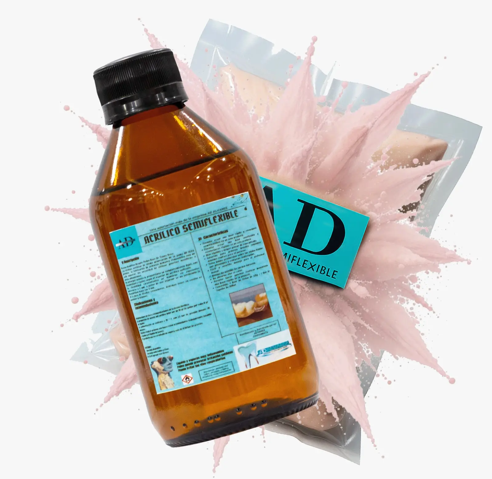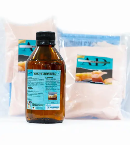 Resina Semiflex Acrylic Polvo Base de Tonos Rosa Las resinas acrílicas de última generación de la gama AD FLEX permite la fabricación de prótesis dentales removibles con un solo material. Sin necesidad de utilizar ganchos metálicos u otros aditamentos. Su principal ventaja la proporciona su comportamiento dual; con flexibilidad o rigidez según el espesor de acrílico aplicado.